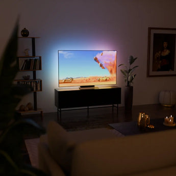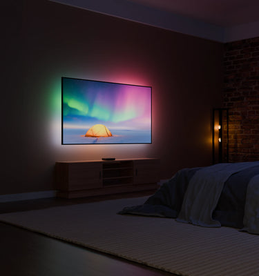 Perfekt für jeden Wohnstil: Die schlanken, flexiblen LED-Streifen lassen sich unauffällig hinter dem TV anbringen – ganz ohne sperrige Zubehörteile oder störende Kabel.