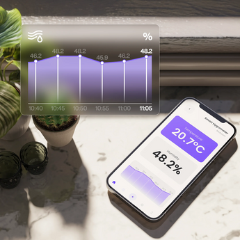 Ontworpen om naadloos op te gaan in elke ruimte: de slimme hygrometer is klein, lichtgewicht en strak vormgegeven. Ideaal voor woonkamers, slaapkamers, wijnkelders, kinderkamers, serres en opbergruimtes.